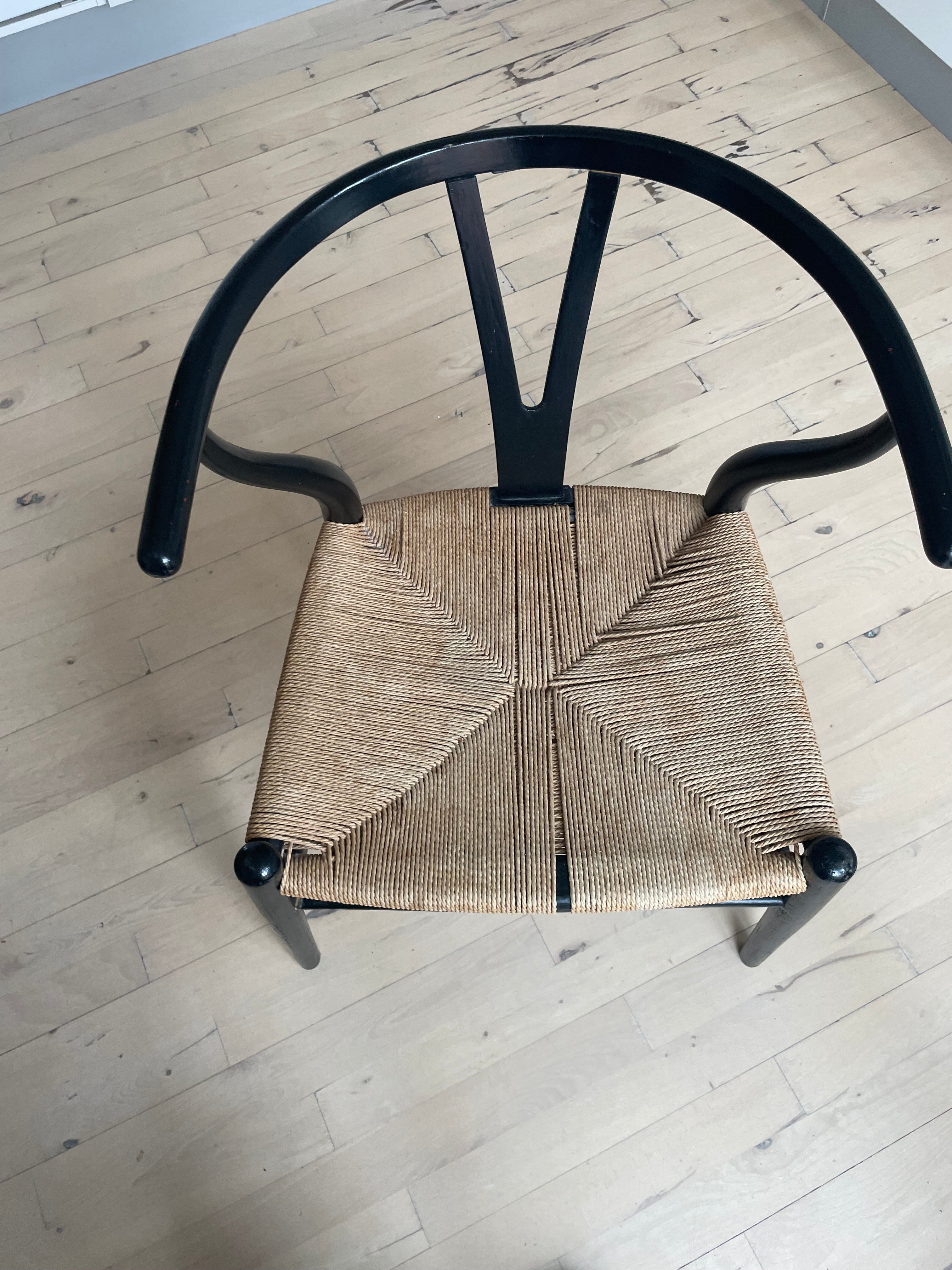 6 stk. PP62-stole har fået nyt sæde med klassisk kuvertflet, mens det originale træstel forbliver urørt. En nænsom forvandling, hvor det slidte flet er erstattet med nyt håndværk, der respekterer stolens oprindelige udtryk.